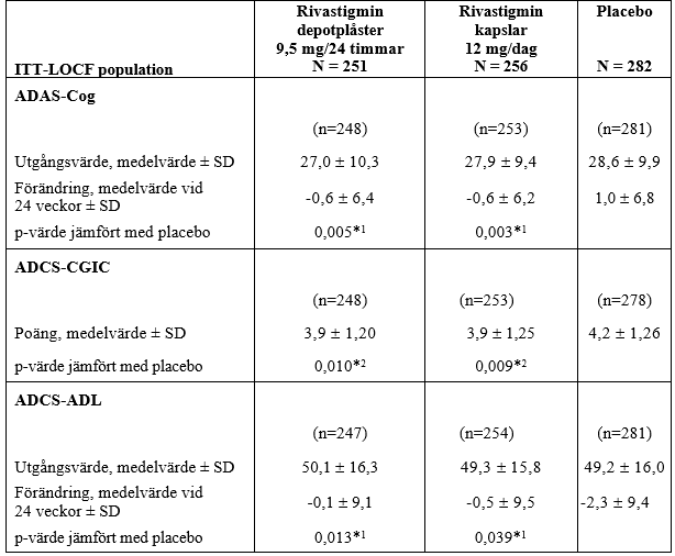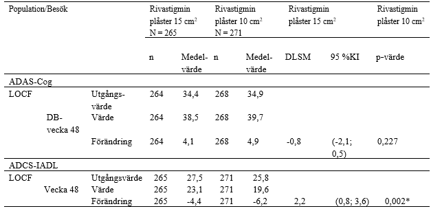 De studerade patienterna i den kontrollerade studien med aktivt jämförelsepreparat hade ett initialt utgångsvärde för MMSE-poäng mellan 10‑24. Studien var utformad att jämföra effekten av 13,3 mg/24 timmar depotplåster med 9,5 mg/24 timmar depotplåster under en 48-veckors dubbelblind behandlingsfas hos patienter med Alzheimers sjukdom som uppvisat funktionell och kognitiv nedsättning efter en initialt 24‑48 veckors öppen behandlingsfas med underhållsdosen 9,5 mg/24 timmar depotplåster. Funktionell nedsättning utvärderades av prövaren och kognitiv nedsättning definierades som en minskning av MMSE-poängen med ≥2 poäng från föregående besök eller en minskning med ≥3 poäng från utgångsvärdet. Effekten har fastställts med ADAS-Cog (Alzheimer’s Disease Assessment Scale – Cognitive subscale, ett funktionsbaserat mått på kognitiv förmåga) och ADCS-IADL (Alzheimer’s Disease Cooperative Study – Instrumental Activities of Daily Living) som mäter instrumentella aktiviteter inkluderande upprätthållande av ekonomin, matlagning, inköp, förmåga att orientera sig i omgivningarna, förmåga att bli lämnad ensam. 48‑veckorsresultaten för de två skattningsskalorna framgår av tabell 4.