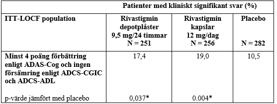 Resultaten för de patienter som svarat kliniskt relevant på behandlingen i den placebokontrollerade 24-veckorsstudien framgår av tabell 3. Kliniskt relevant förbättring definierades på förhand som minst 4 punkters förbättring enligt ADAS-Cog, ingen försämring enligt ADCS-CGIC och ingen försämring enligt ADCS-ADL.