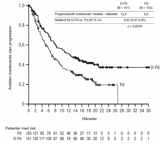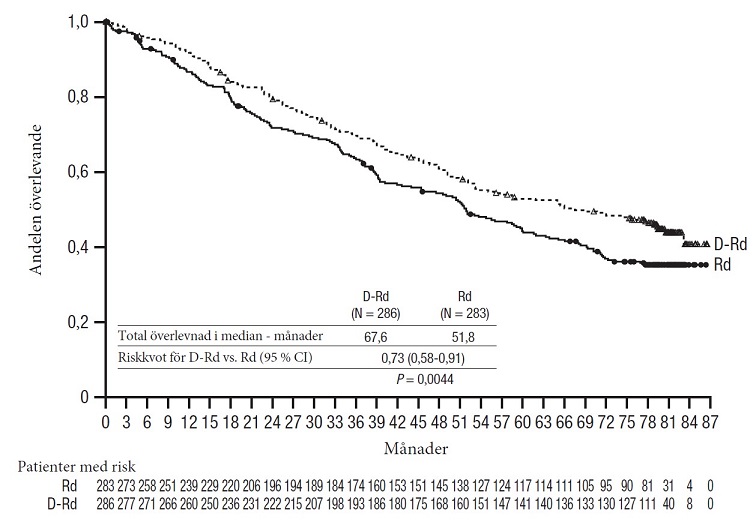 Dexametason ska administreras med dosen 40 mg på dag 1, 2, 8, 9, 15, 16, 22 och 23 i cykel 1 och 2, och med dosen 40 mg på dag 1-2 och 20 mg på följande doseringsdagar (dag 8, 9, 15, 16) i cykel 3-4. Dexametason 20 mg ska administreras på dag 1, 2, 8, 9, 15, 16 i cykel 5 och 6.
