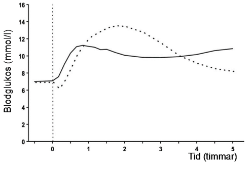 Fig. I. Blodglukoskoncentrationer efter en singeldos insulin aspart injicerad omedelbart före en måltid (den heldragna kurvan) eller lösligt humant insulin administrerat 30 minuter före en måltid (den prickade kurvan) hos patienter med typ 1-diabetes mellitus.