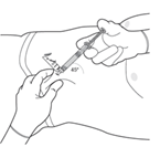 Stick in kanylen helt i den subkutana vävnaden på buken. Injektionsvinkeln beror på mängden subkutan vävnad. Ge läkemedlet med en långsam och jämn injektion. Fortsätt trycka in kolven tills allt läkemedel har injicerats.