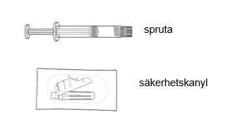 Ta upp foliepåsen och säkerhetskanylen ur kartongen. Öppna påsen och ta upp sprutan. Kassera syreabsorbenten, den behövs inte längre.