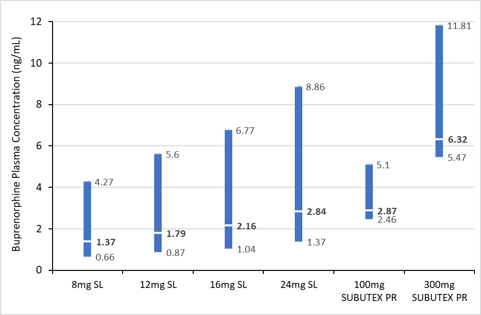 Varje stapel visar de geometriska medelvärdena för buprenorfinkoncentrationerna: dalkoncentration (längst ner), medelkoncentration i plasma (vit markering) och maximal plasmakoncentration (högst upp).