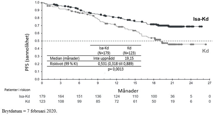 Med en medianuppföljningstid på 49,31 månader dog 14,8 % av patienterna i Isa-VRd-armen och 12,7 % av patienterna i VRd-armen.