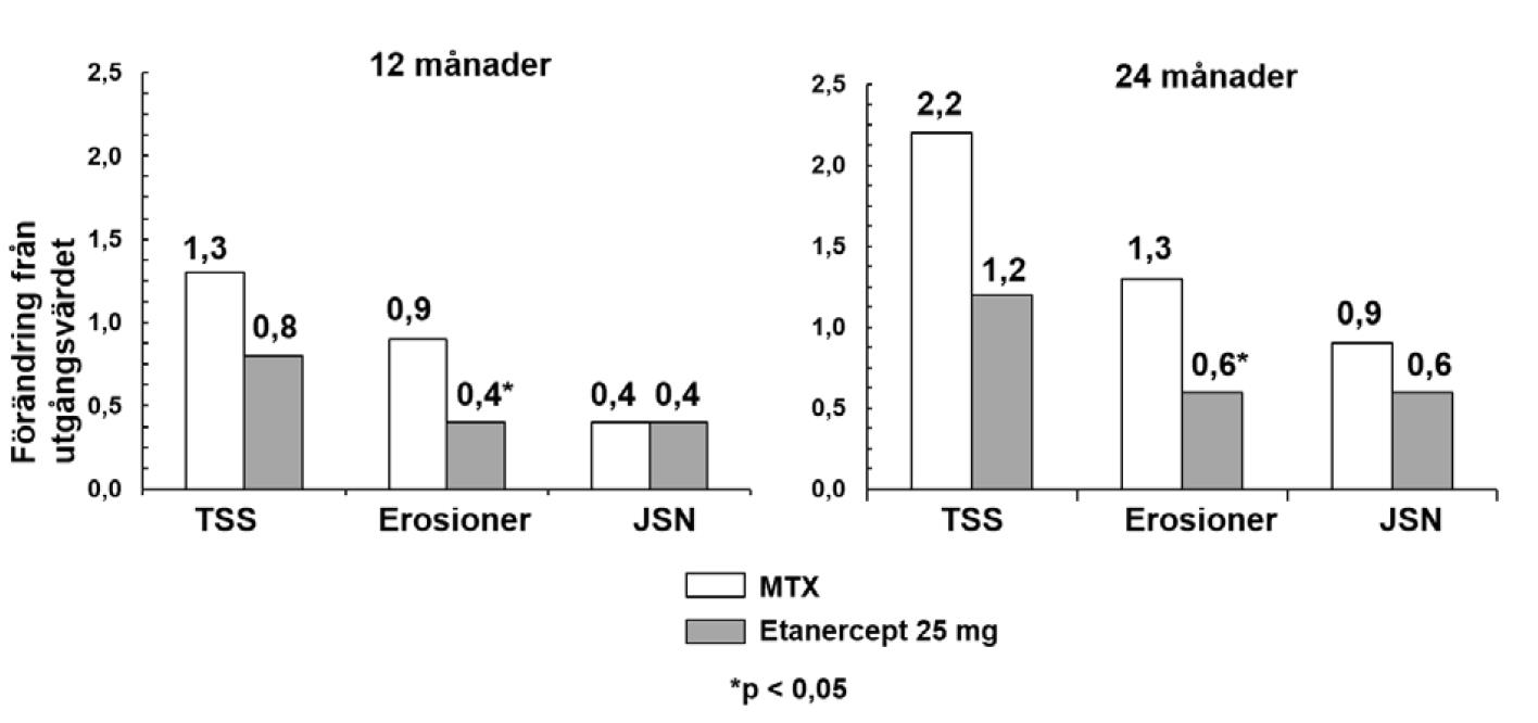 Långtidssäkerhet av etanercept som monoterapi (n = 103), etanercept i kombination med metotrexat (n = 294) eller metotrexat som monoterapi (n = 197) utvärderades upp till 3 år i ett register med 594 barn i åldrarna 2 till 18 år med juvenil idiopatisk artrit, varav 39 av dem var i 2 till 3‑årsåldern. Generellt, rapporterades infektioner oftare hos patienter som behandlades med etanercept jämfört med patienter som behandlades med enbart metotrexat (3,8 mot 2 %). Infektionerna relaterade till behandling med etanercept var av mer allvarlig karaktär.