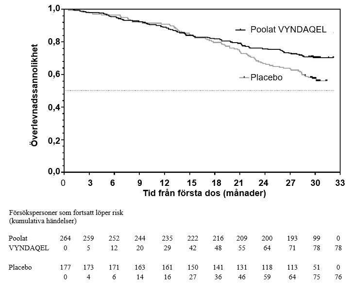 Genom att tillämpa F-S-metoden individuellt på varje dosgrupp reducerade tafamidis i doser på både 80 mg och 20 mg mortalitet av alla orsaker och frekvens av hospitaliseringar av kardiovaskulära orsaker jämfört med placebo (p=0,0030 respektive p=0,0048). Resultat från den primära analysen, 6MWT vid månad 30 och KCCQ-OS vid månad 30 var statistiskt signifikant för tafamidisdoser på både 80 mg och 20 mg jämfört med placebo, med liknande resultat för båda doserna.