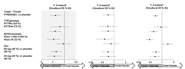 Resultat från F-S-metod uttryckt som vinstkvot för det kombinerade effektmåttet och dess komponenter (mortalitet oavsett orsak och frekvens för hjärtkärlrelaterade sjukhusinläggningar) visade konsekvent på bättre resultat för tafamidis jämfört med placebo per dos och i alla undergrupper (vild typ, variant och NYHA-klass I och II, samt III) med undantag för frekvensen för hjärtkärlrelaterade sjukhusinläggningar i NYHA-klass III (figur 2) som är högre i den tafamidisbehandlade gruppen jämfört med placebo (se avsnitt Dosering och administreringssätt). Analyser av 6MWT och KCCQ-OS visade också på bättre resultat med tafamidis jämfört med placebo inom respektive undergrupp.
