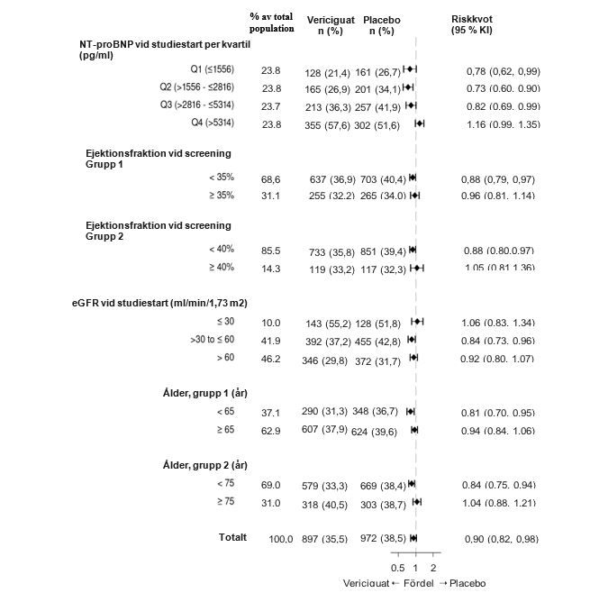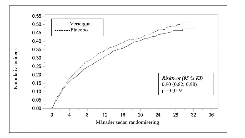 2 Riskkvot (vericiguat i förhållande till placebo) och konfidensintervall från en Cox proportionell riskmodell.