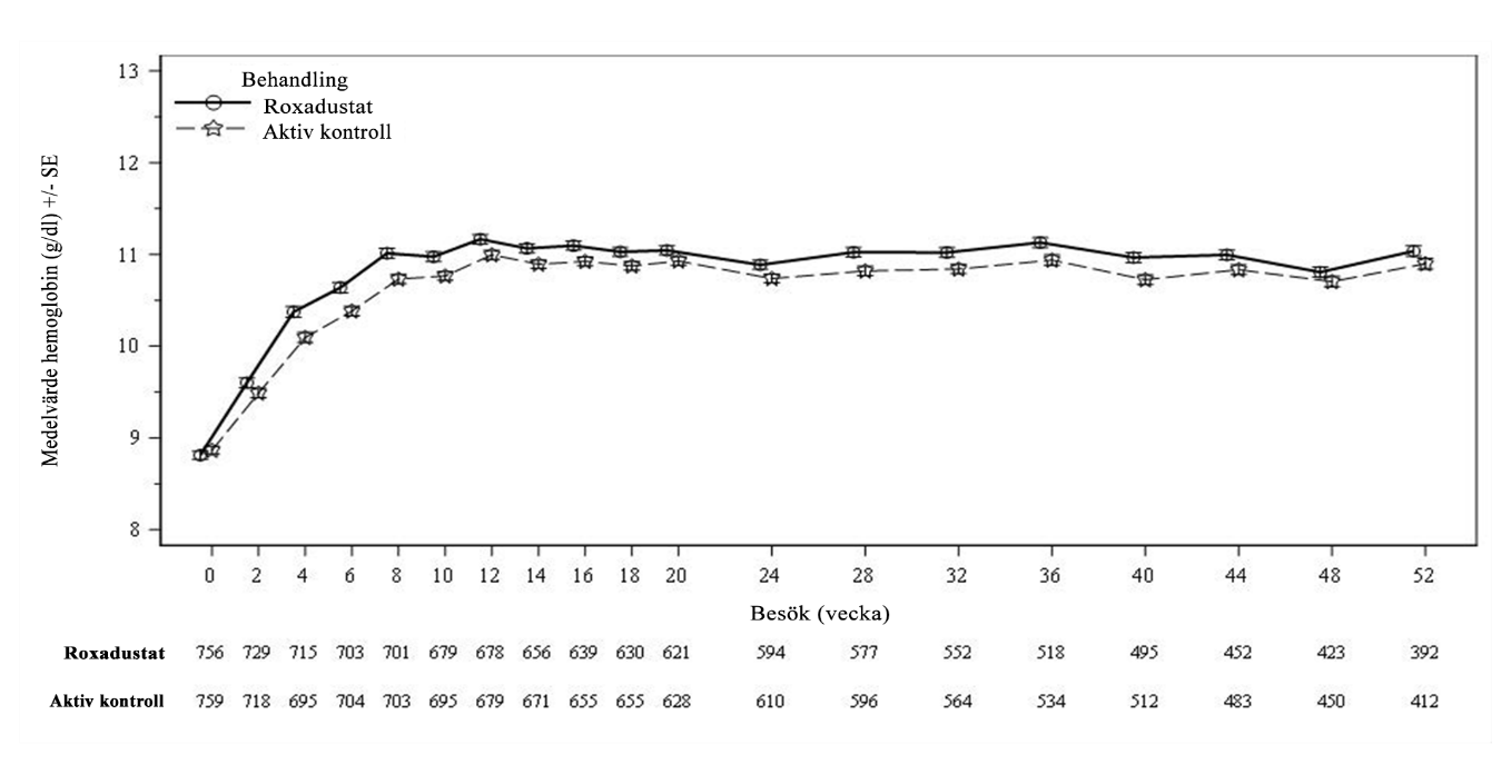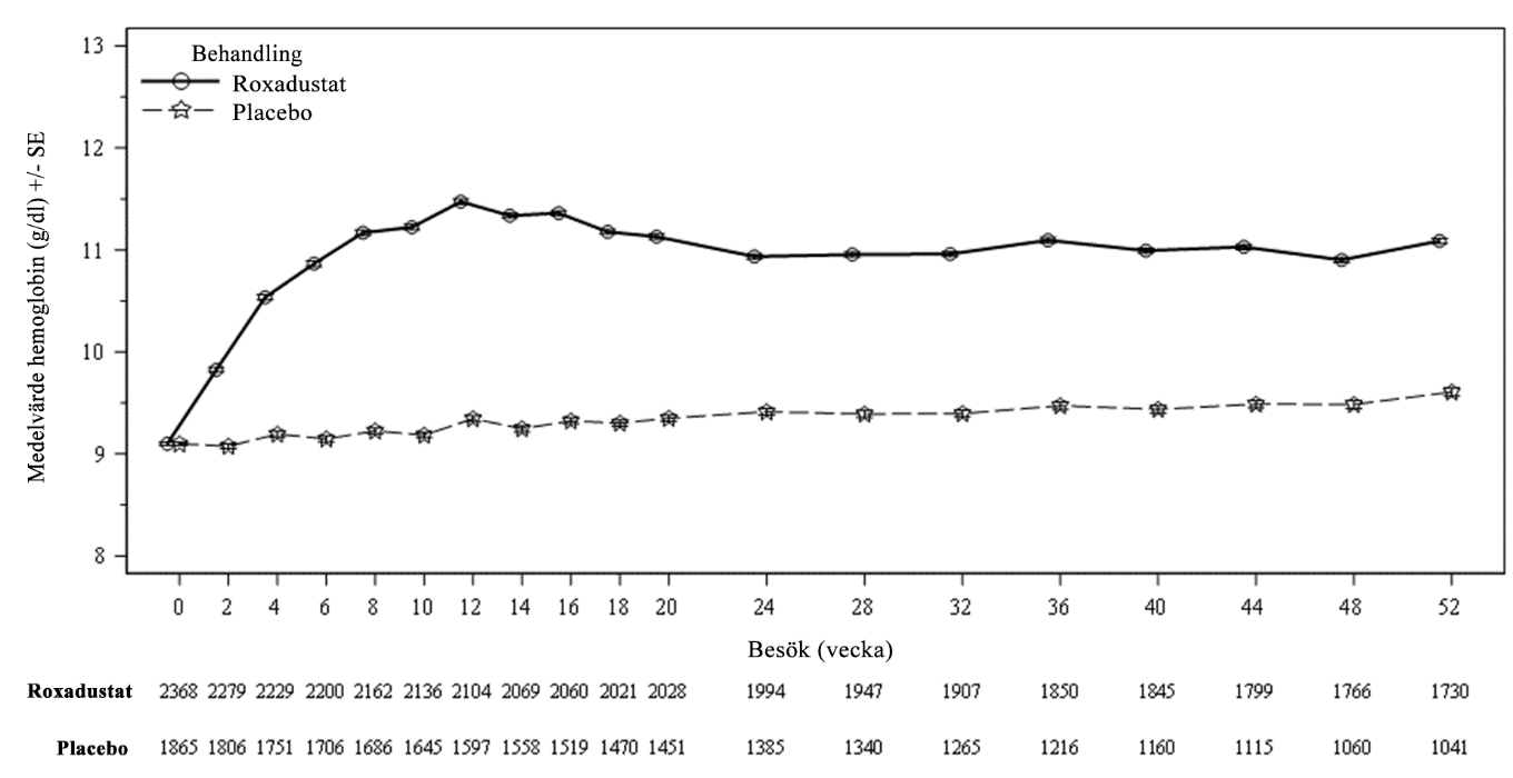 Trombos i kärlaccessen rapporterades som mycket vanligt hos patienter med kronisk njursjukdom som fick dialys i kliniska studier (se avsnitt Biverkningar). Hos dessa patienter som behandlades med roxadustat var förekomsten av trombos i kärlaccessen högst under de första 12 veckorna efter behandlingsstart, i synnerhet vid Hb-värden på över 12 g/dl och då Hb ökat med mer än 2 g/dl under 4 veckor. Det rekommenderas att Hb-värdet monitoreras noga och att dosen justeras enligt dosjusteringsschemat (se tabell 2) för att undvika dessa värden.