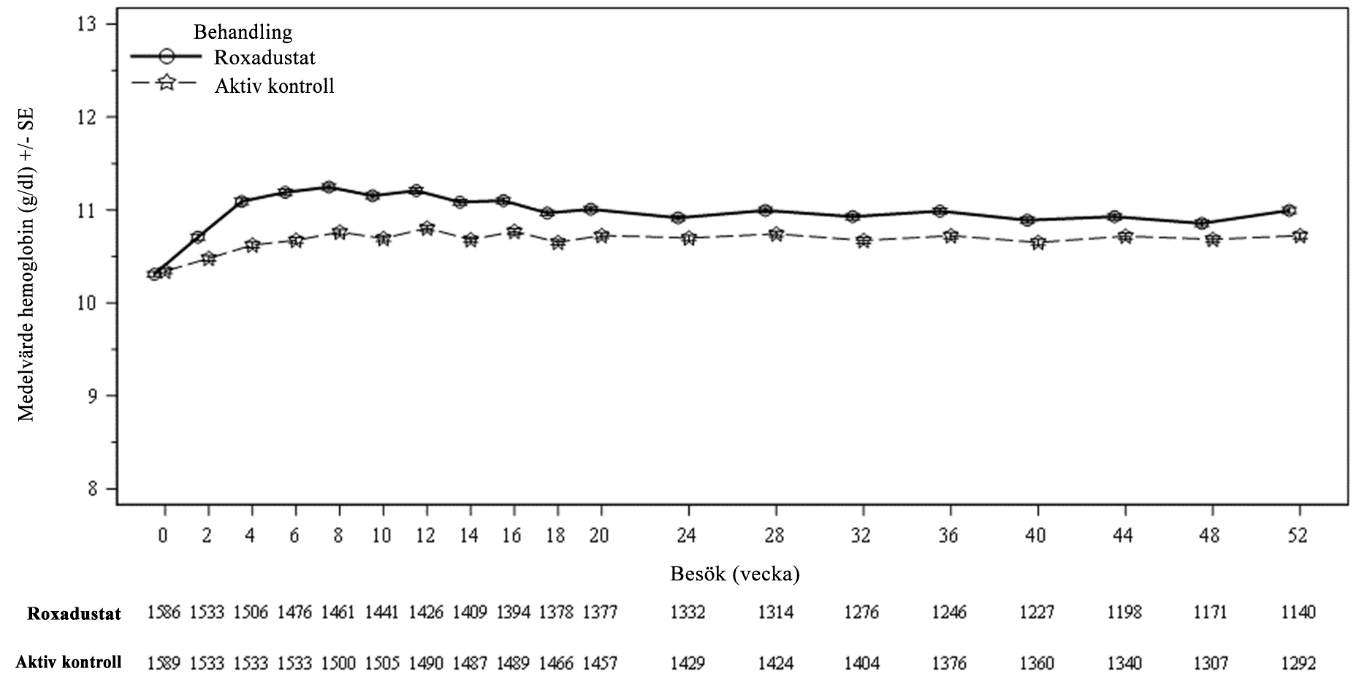 Den totala kardiovaskulära risken och mortalitetsrisken vid behandling med roxadustat har uppskattats att vara jämförbara med den kardiovaskulära risken och mortalitetsrisken vid ESL-behandling baserat på data från en direkt jämförelse av de båda behandlingarna (se avsnitt Farmakodynamiska egenskaper). Eftersom risken för patienter med anemi associerad med kronisk njursjukdom som inte fick dialys inte kunde beräknas med tillräcklig konfidens jämfört med placebo, ska beslut om att behandla sådana patienter med roxadustat baseras på liknande överväganden som normalt görs innan behandling med ett ESL sätts in. Dessutom har flera bidragande faktorer identifierats som kan innebära en sådan risk, inklusive uteblivet svar på behandling och byte för dialyspatienter som är stabila på ESL-behandling (se avsnitt Dosering och administreringssätt och Farmakodynamiska egenskaper). Vid uteblivet svar ska behandling med roxadustat inte fortsätta längre än 24 veckor efter att behandlingen påbörjades (se avsnitt Dosering och administreringssätt). Byte för dialyspatienter som redan är stabila på ESL-behandling ska endast övervägas om det finns en giltig klinisk anledning (se avsnitt Dosering och administreringssätt). För stabila ESL-behandlade patienter med anemi associerad med kronisk njursjukdom som inte behandlas med dialys, kunde risken inte uppskattas eftersom dessa patienter inte har studerats. Beslut om att behandla dessa patienter med roxadustat ska grundas på ett övervägande av fördelar och risker för den enskilda patienten.