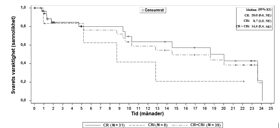 b. Icke-komplett remission inkluderar alla icke-CR / CRi-patienter vars svar klassificeras som ofullständig remission med partiell hematologisk återhämtning, blastfri hypoplastisk eller aplastisk benmärg (N = 4), partiellt svar (N = 0), inget svar (N = 9) eller inte utvärderbar (N = 3).