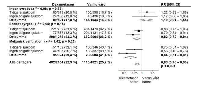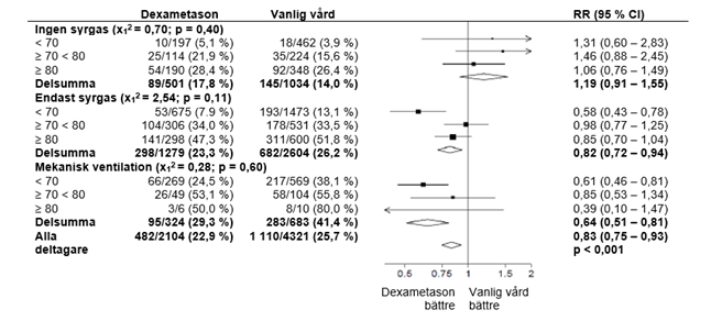 I dexametasongruppen var förekomsten av dödsfall lägre än i den vanliga vårdgruppen bland patienter som fick invasiv mekanisk ventilation (29,3 % jämfört med 41,4%; hastighetsförhållande, 0,64; 95 % KI, 0,51 till 0,81) och hos dem som får extra syrgas utan invasiv mekanisk ventilation (23,3 %jämfört med 26,2 %; frekvenskvot, 0,82; 95 % KI, 0,72 till 0,94).