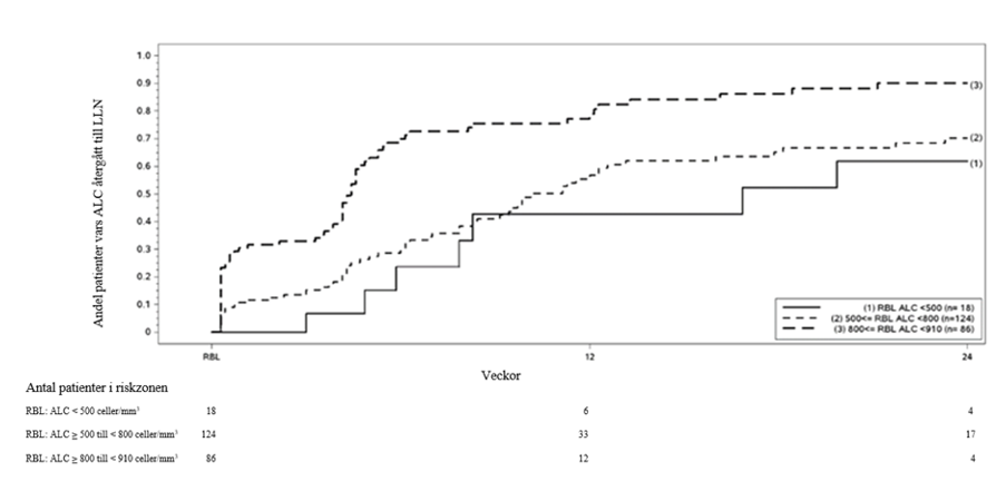 • Hos patienter med konstant måttligt minskat absolut antal lymfocyter ≥ 0,5 x 109/l till < 0,8 x 109/l under mer än 6 månader ska nyttan/risken med behandlingen omprövas.