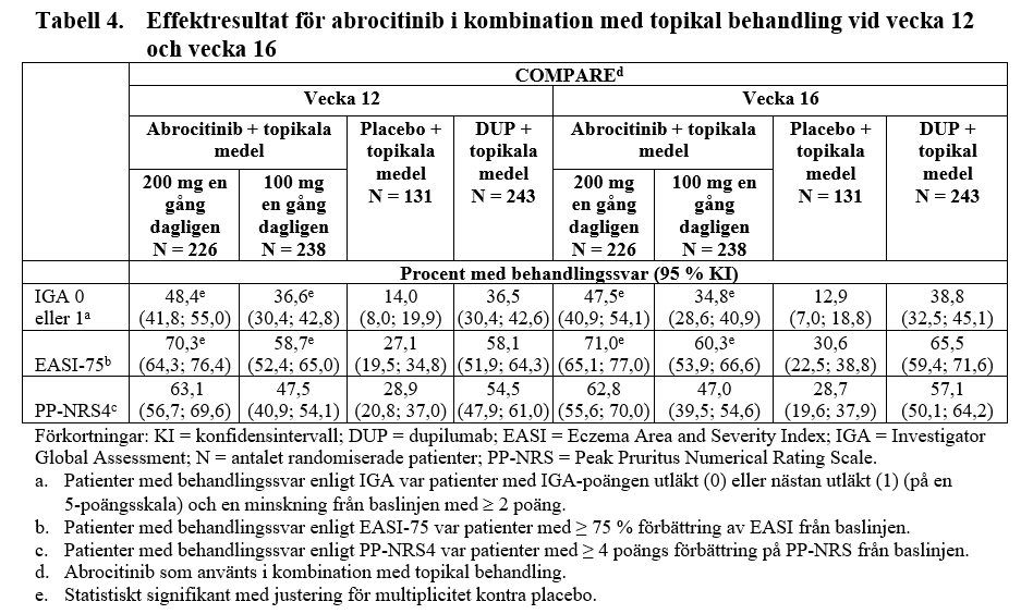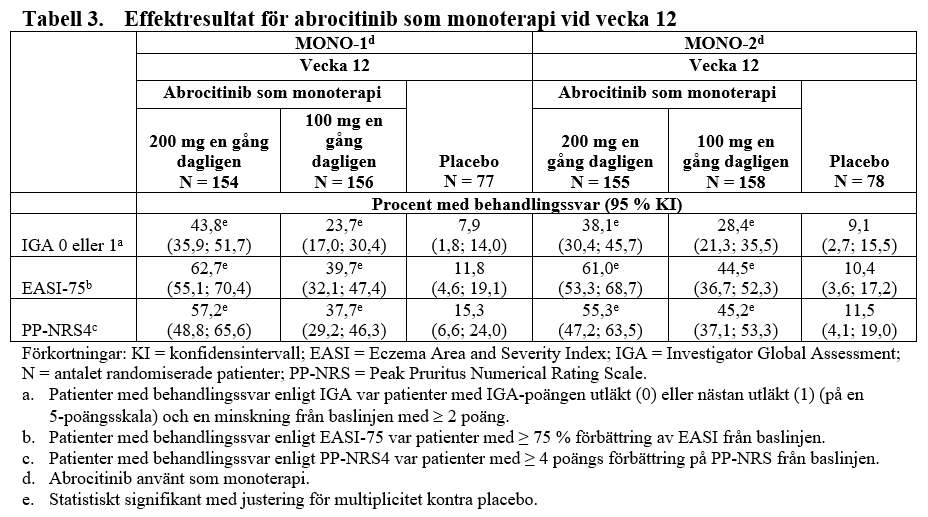 Resultat från 12 veckors behandling med abrocitinib hos ungdomar i en sammanslagning av MONO-1 och MONO-2, samt TEEN-studien visas i tabell 6.